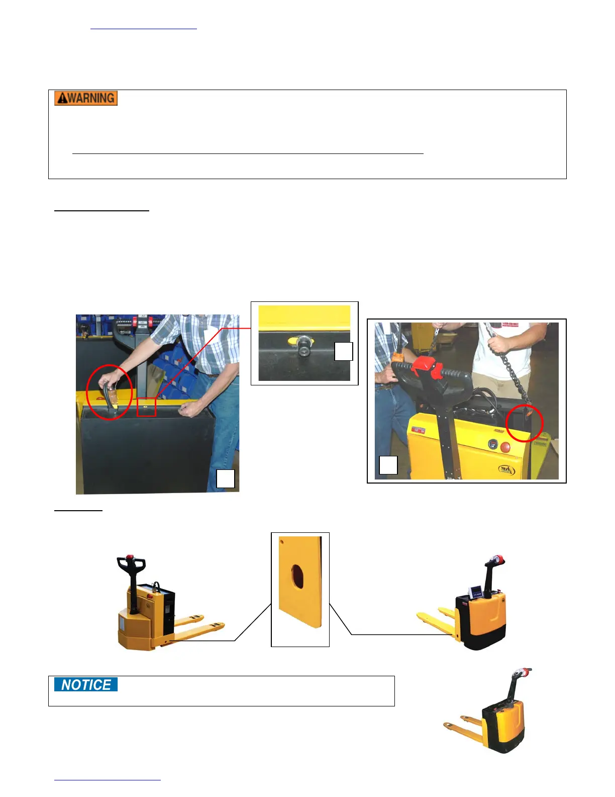 Approach the pallet truck from the operator side. Lift the EPT just a few