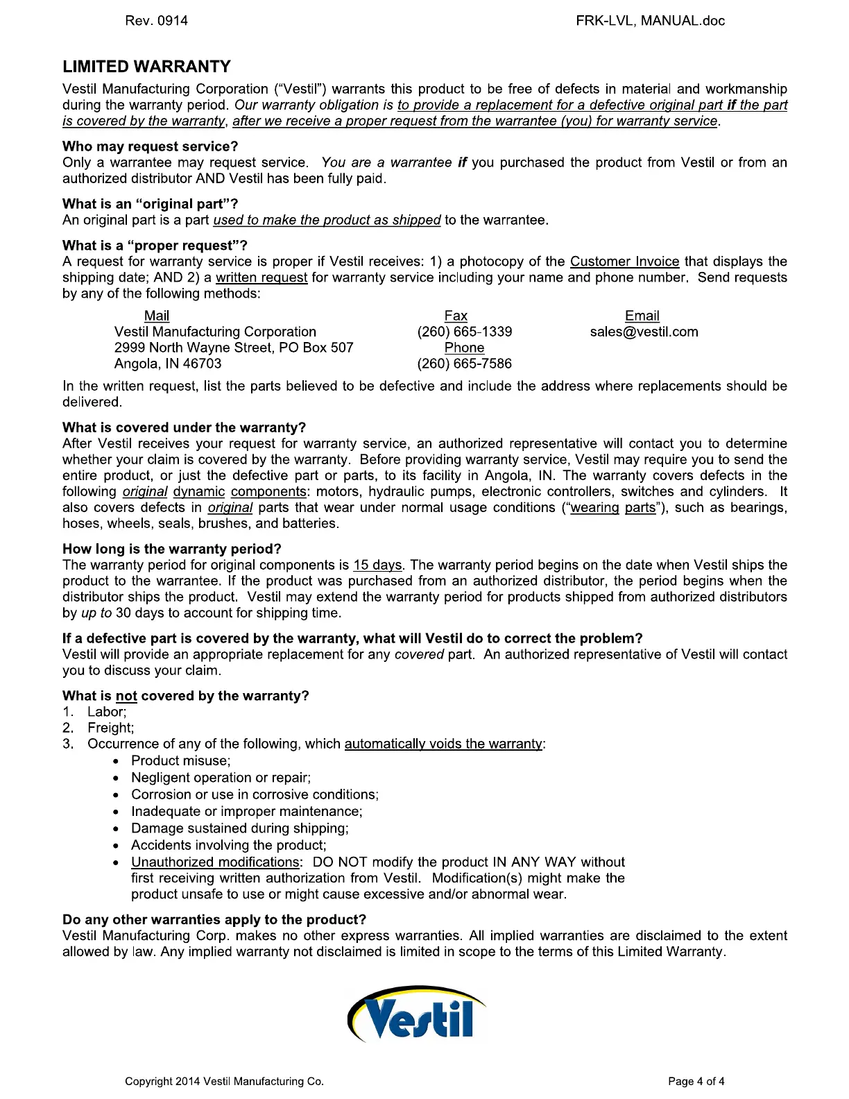 Bekijk gratis de handleiding van Vestil FRK-LVL, stel vragen en lees de antwoorden op veelvoorkomende problemen, of gebruik onze assistent om sneller informatie in de handleiding te vinden of uitleg te krijgen over specifieke functies.
