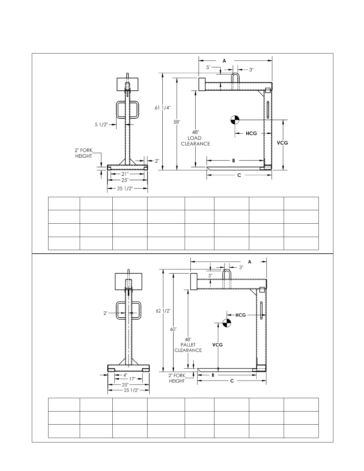 Dimensions, net weight, capacity (maximum rated load), and centers of gravity for each HDP model are
