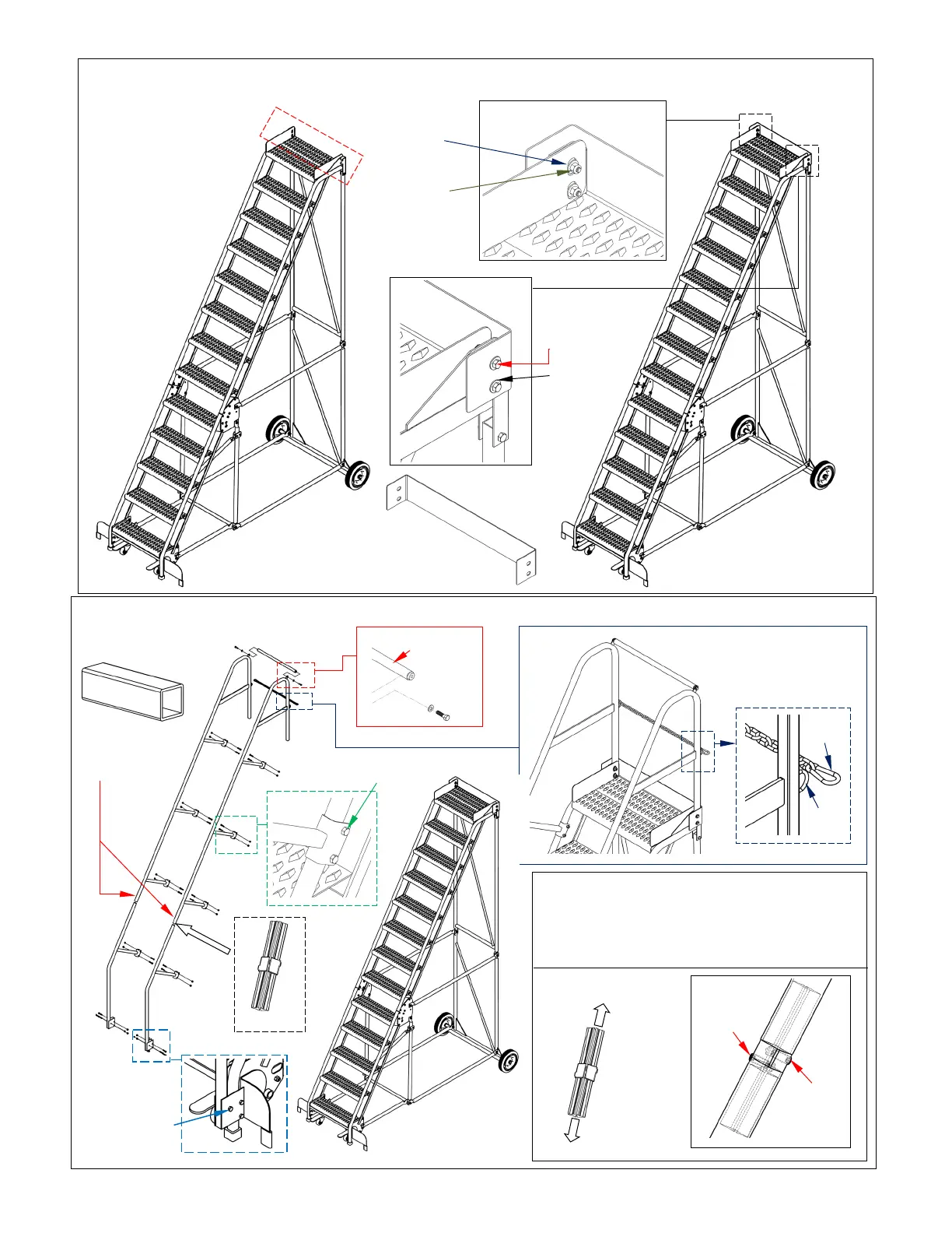 Step 9: Fasten the upper and lower portions of the handrails to the ladder assembly with