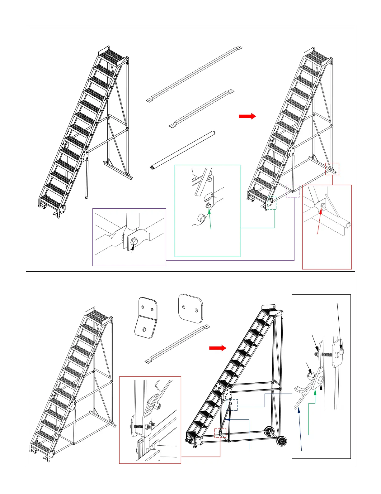 models); 44-014-595 (16 step models)] to the front vertical supports. First, fasten the diagonal frame brace to the formed brace