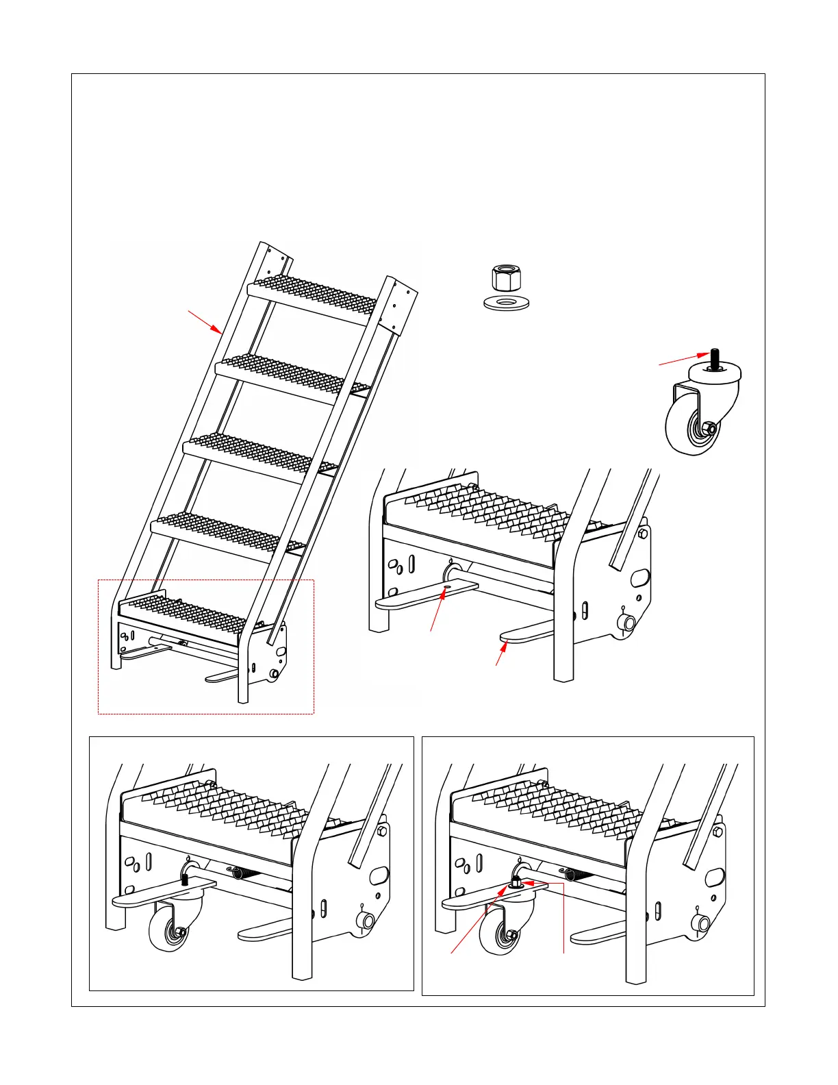 1. Gather the lower step weldment, stem casters (16-132-164), 2 lock nuts (37024), and 2 flat washers