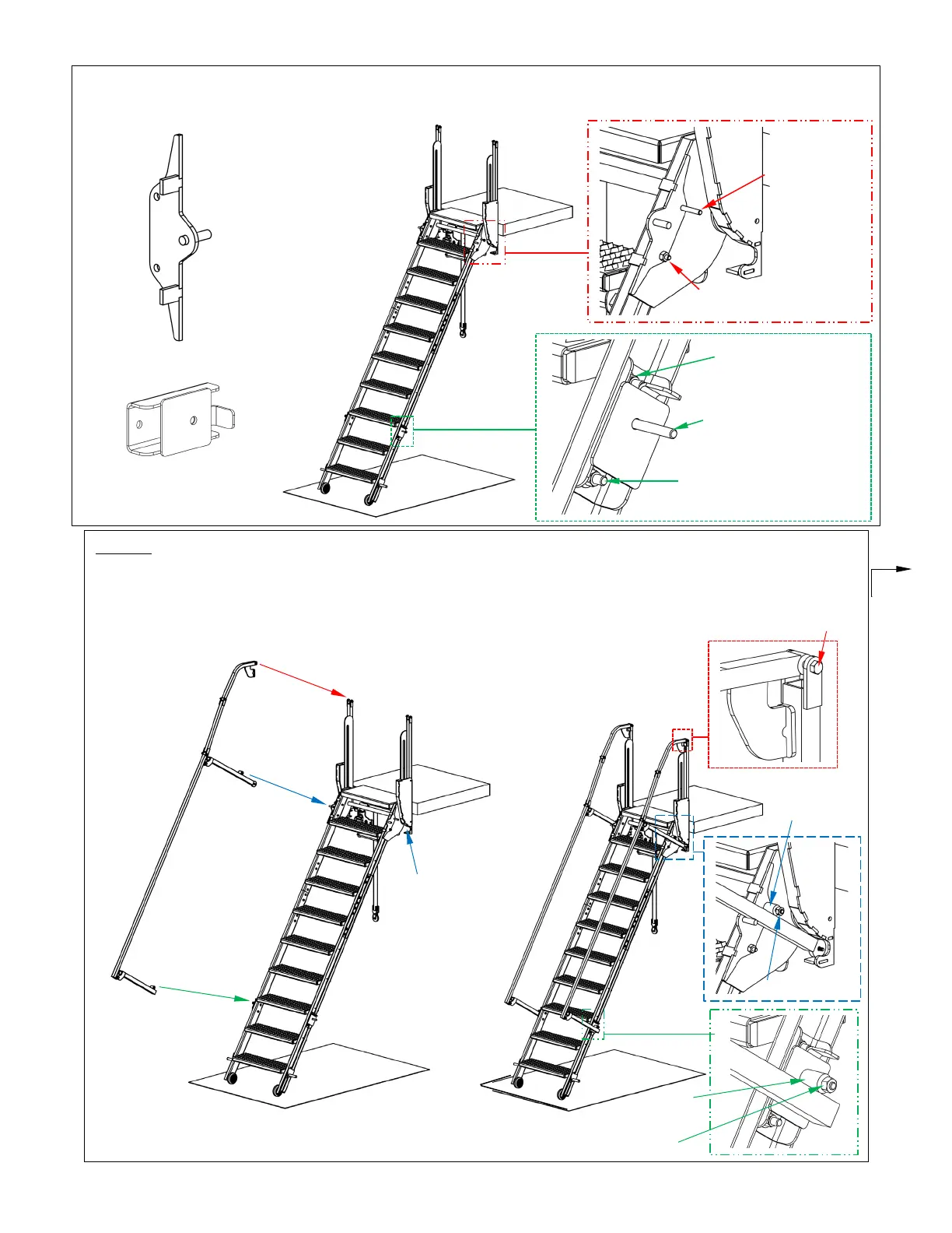 Step 11: Attach the handrail assemblies made in step 9 to the siderails. To make connections b and