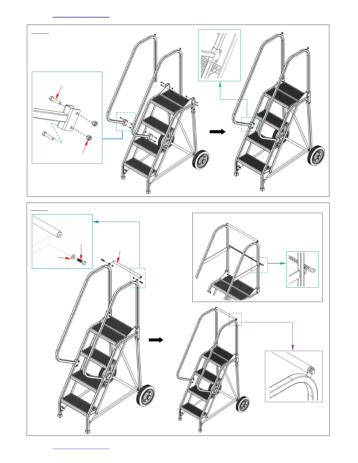 Step 6: Install the handrail cross bar. [NOTE: 12-step models also include a chain midrail.]