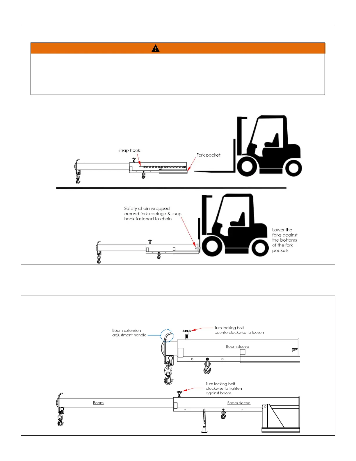 2. Securely connect the boom to the carriage of the forklift with the safety chain.