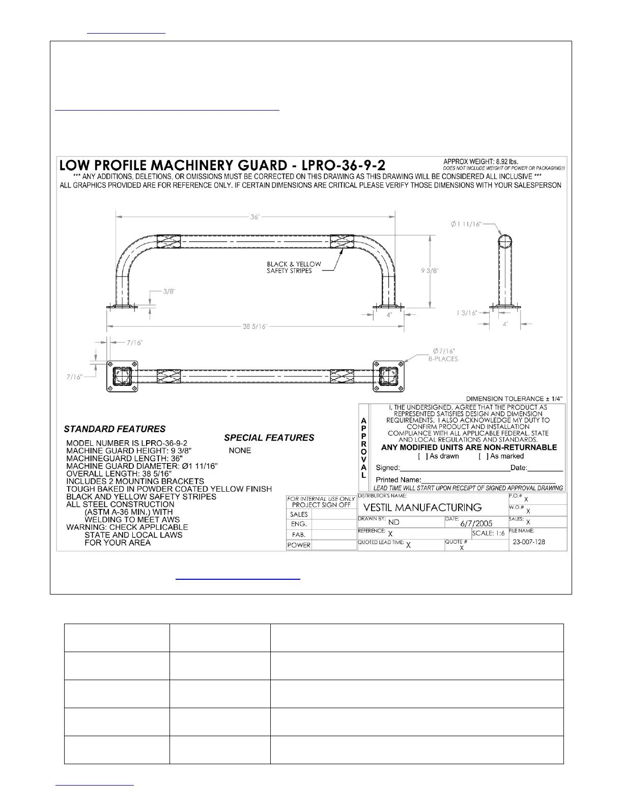 Vestil’s website. Specifications include attributes like a guard’s dimensions and net weight. To access