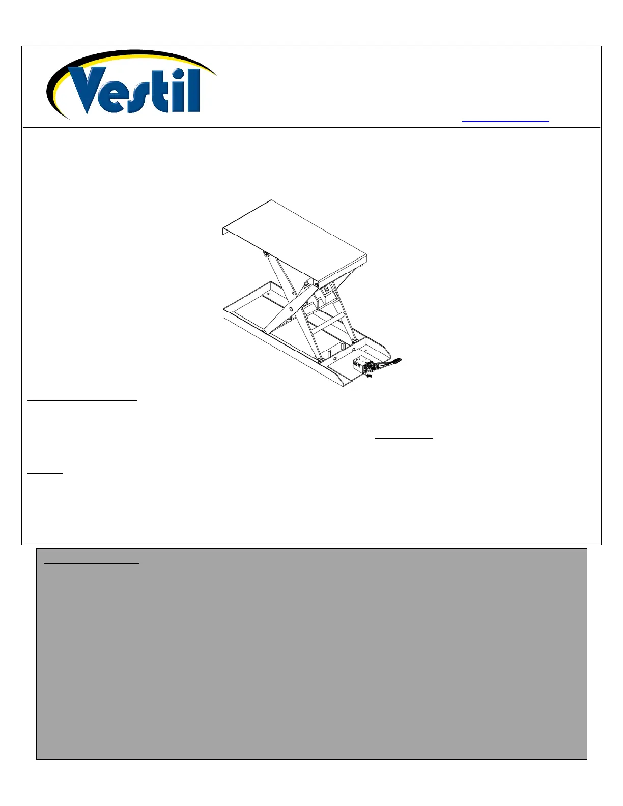 a) Instructions in this manual; or b) information provided on labels affixed to the product. Neither is Vestil responsible for any