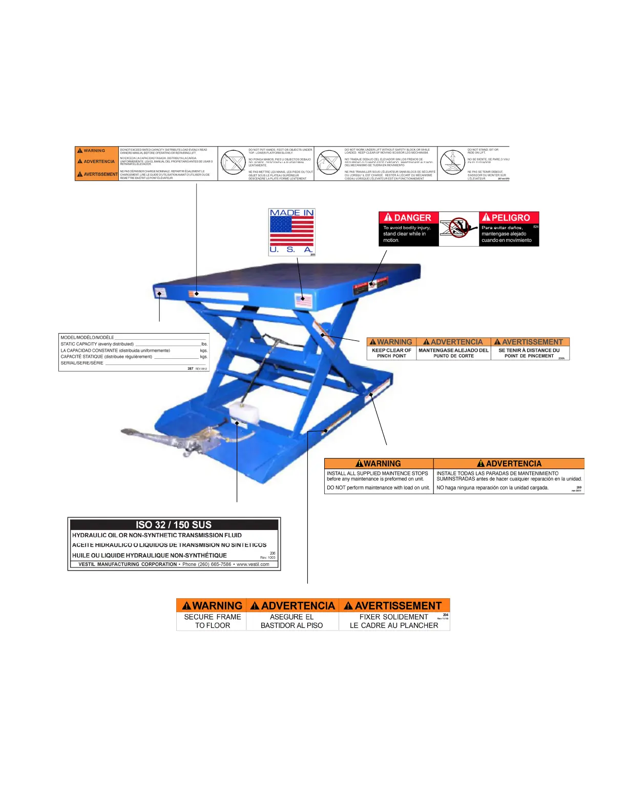 The table should be labeled as shown below. Contact Vestil to order replacement labels.
