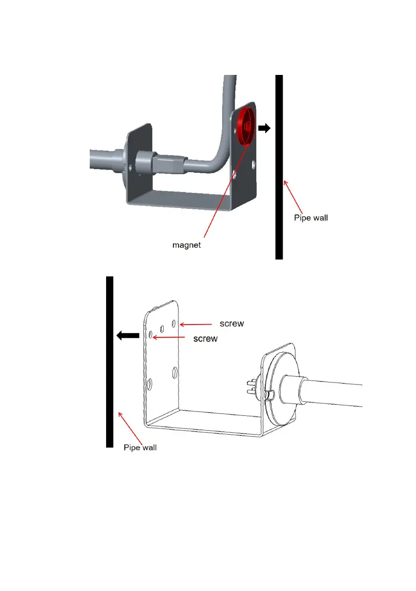 the pipe, The two screw holes of the magnetic support shall be aligned with