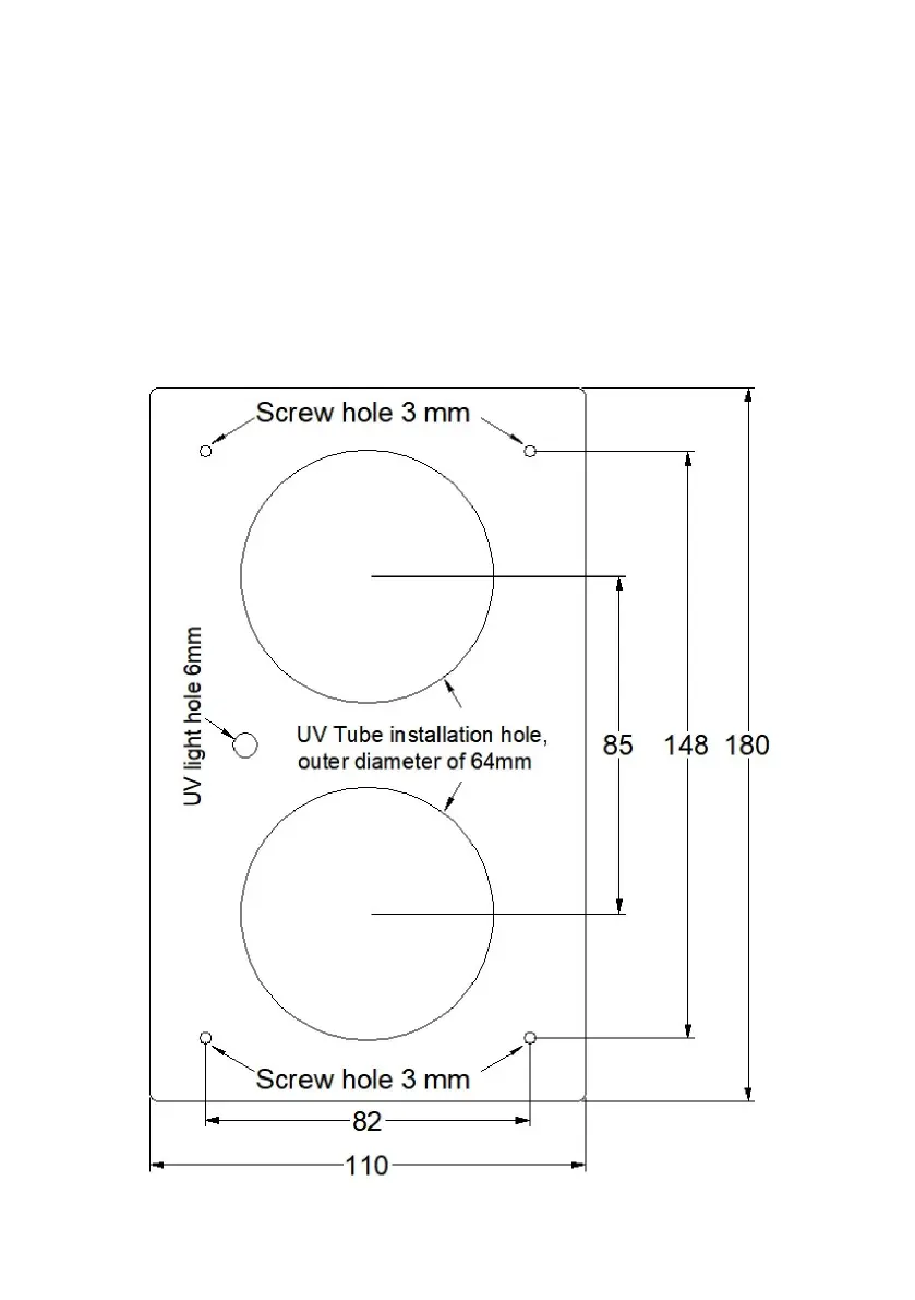 screw holes, one 6mmUV lamp viewing hole, two 64mmUV lamp mounting