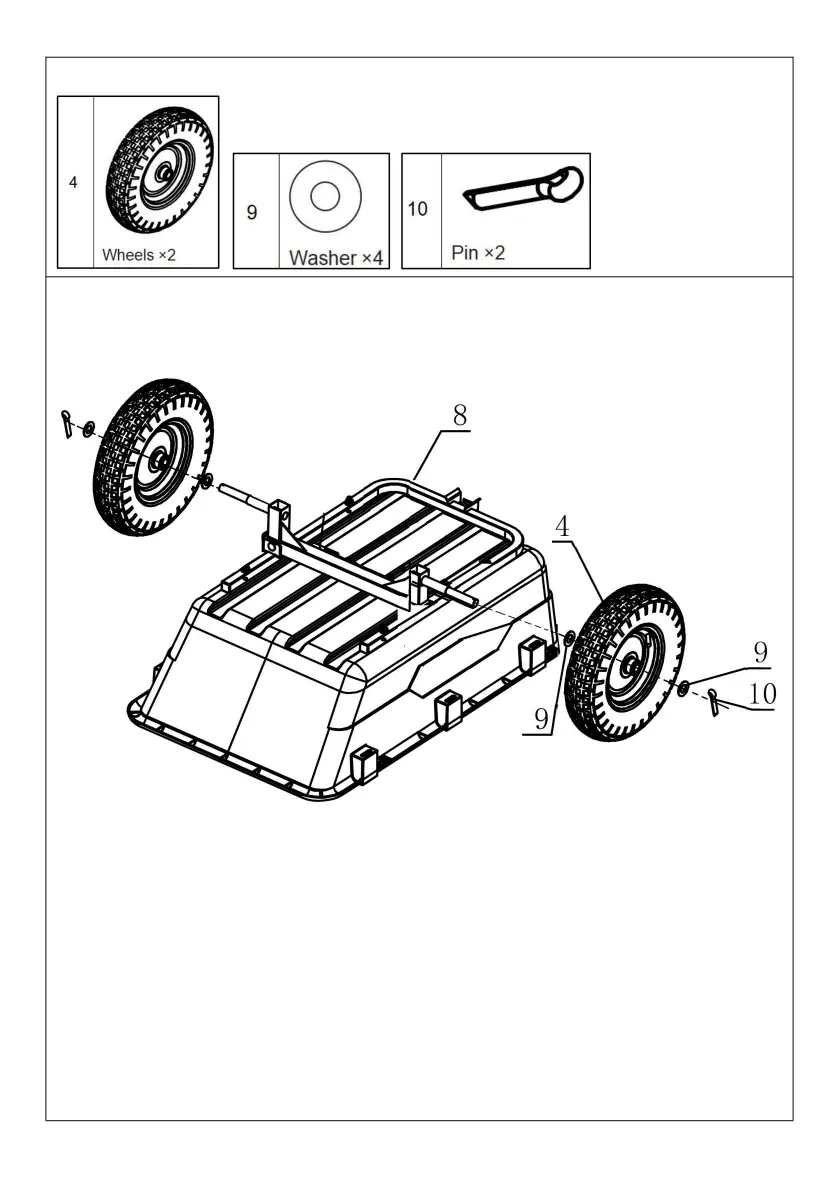 3. Mettere un'altra rondella (n. 9 x 2) su ciascun lato dell'asse delle ruote.