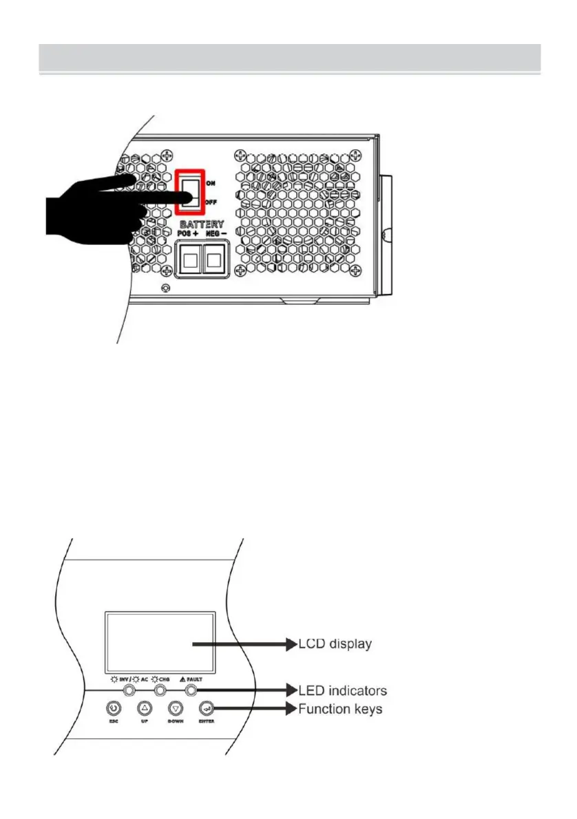 Vorderseite des Wechselrichters. Es umfasst drei Anzeigen, vier Funktionstasten und ein