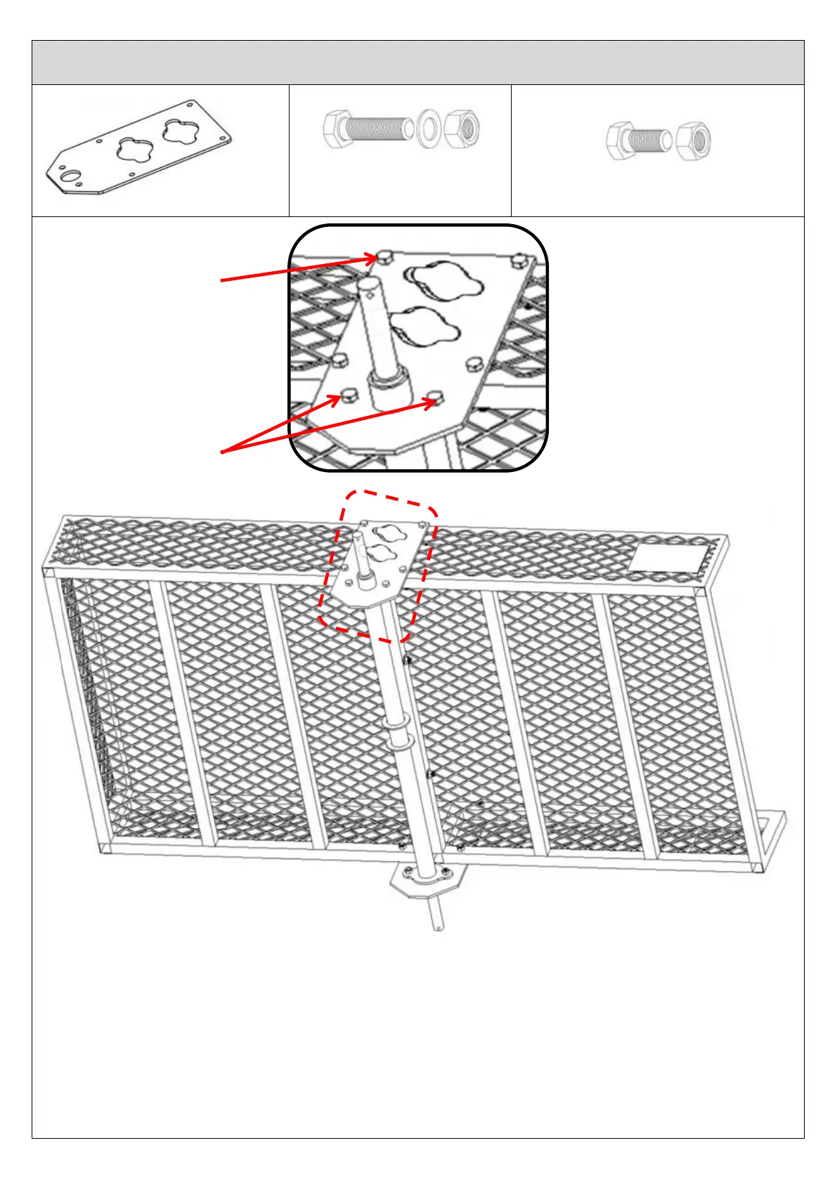 1. Sätt in axeln (nr 4) i hålen på den fasta plattan (nr 3) .