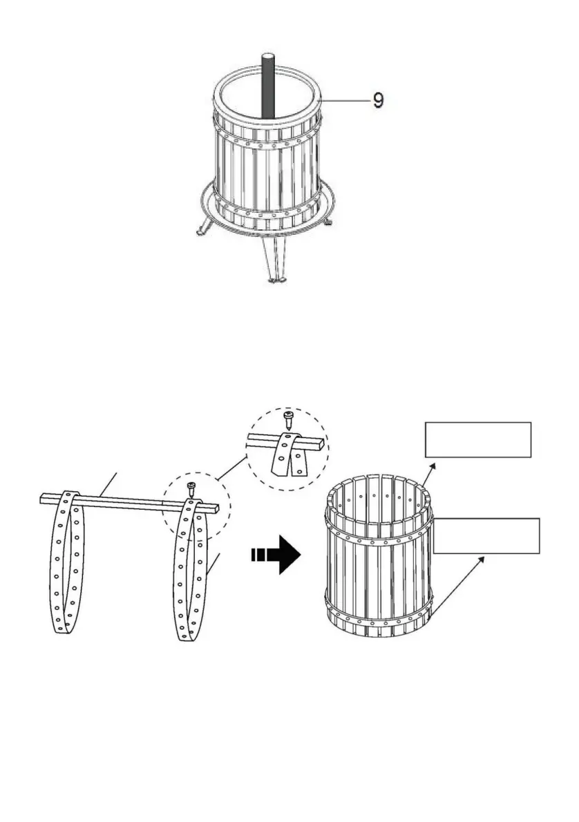 1. Zusammenbau des Holzfasses --- Den Metallring (10) und die Käfiglatte (12) zusammenbauen. Achten Sie