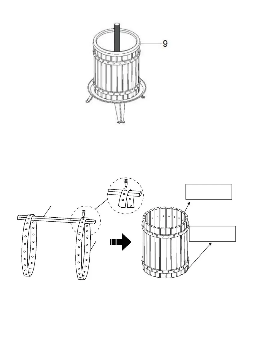 1. Wooden Barrel Assembly--- Assemble Metal Ring (10) and Cage Slat (12),