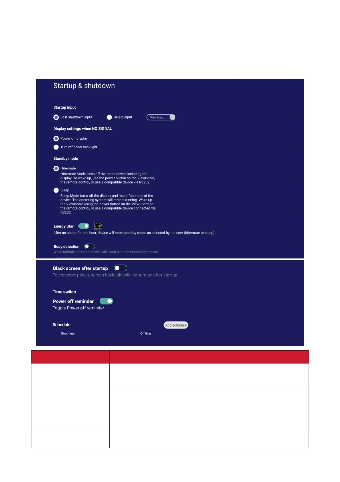 (Zwart scherm na opstarten), Power o Reminder (Herinnering uitschakelen) en