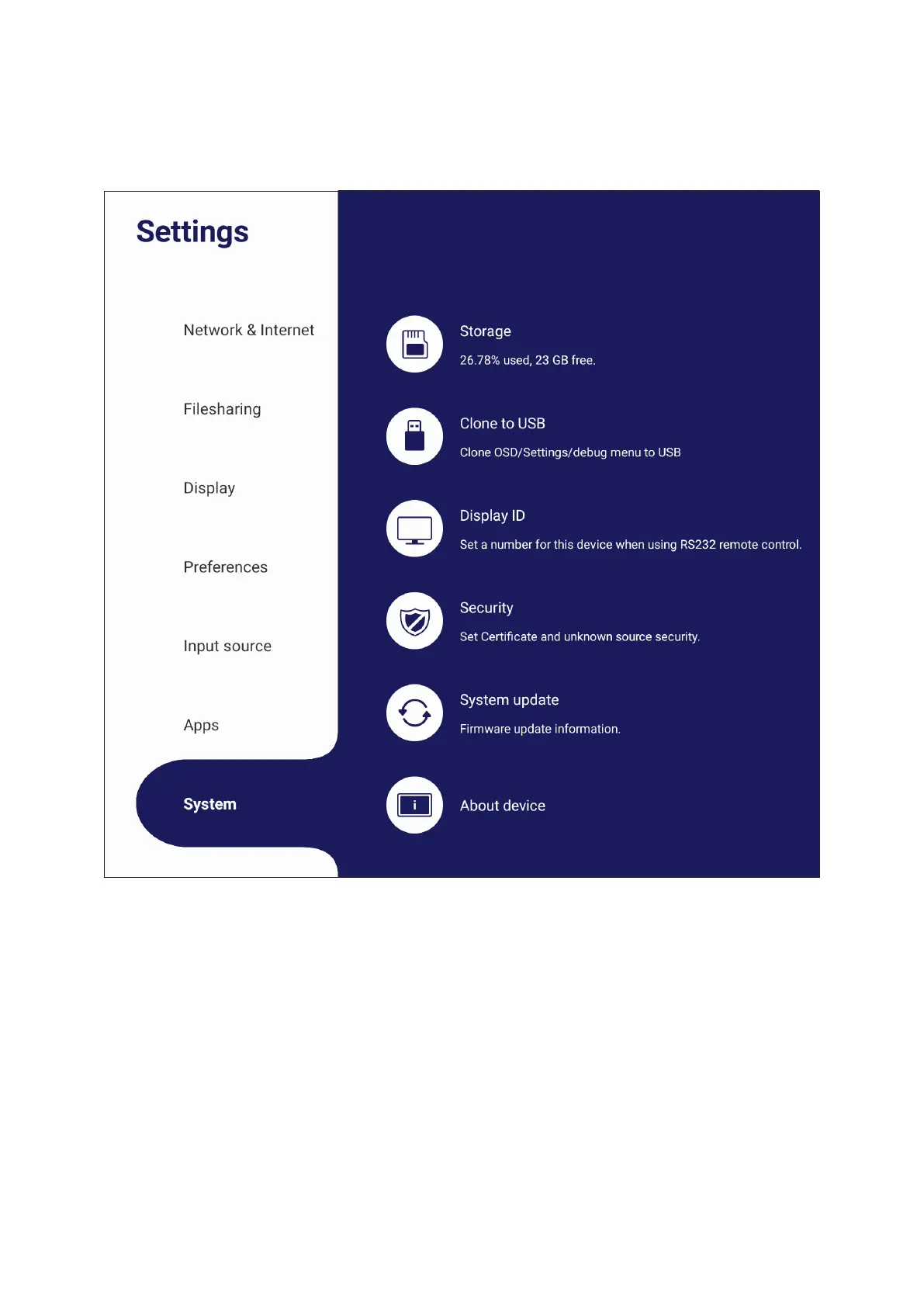 Security (Beveiliging), System Update (Systeemupdate) en About device (Over