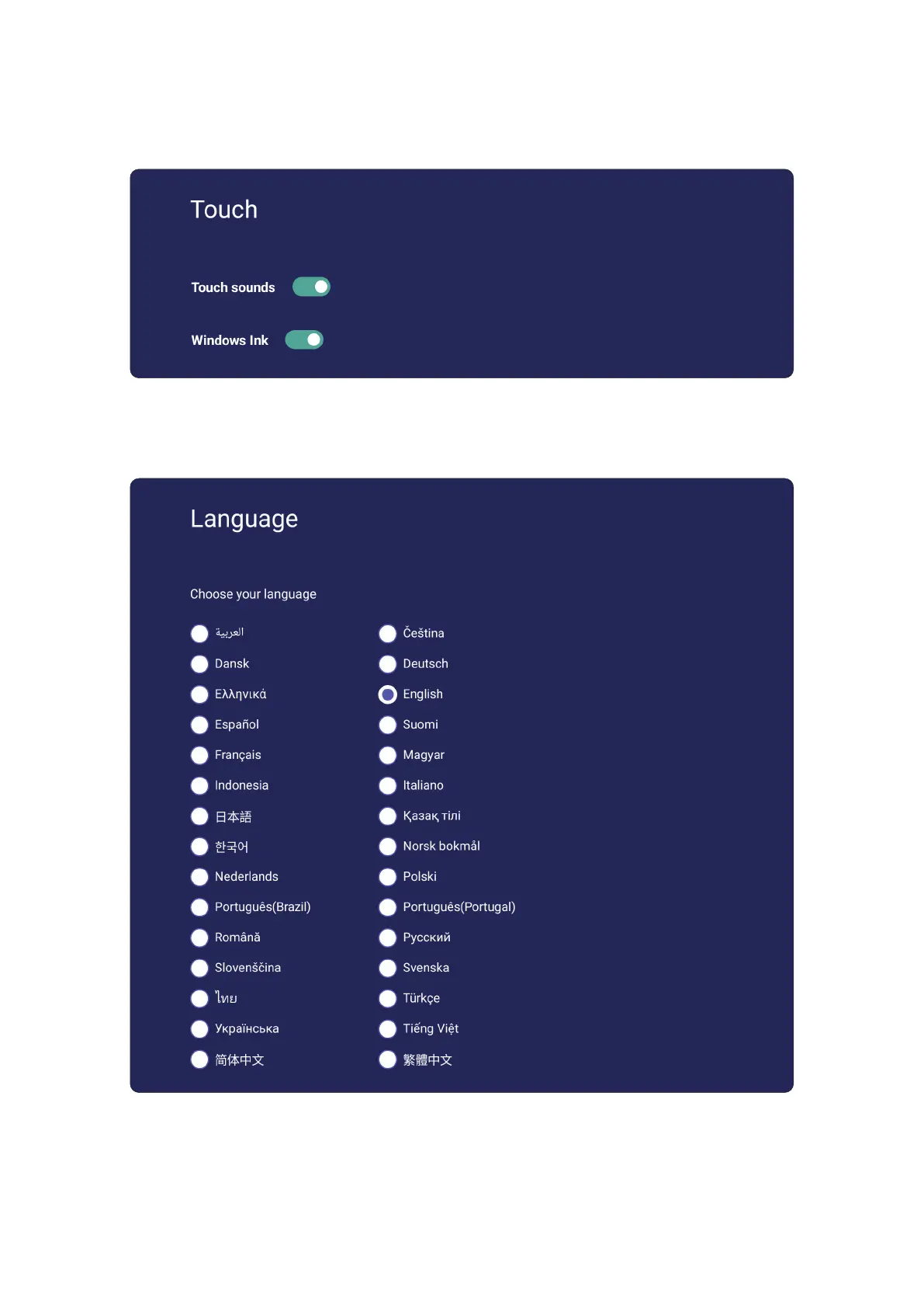 (Aanraakgeluiden) en Windows Ink (Windows-inkt) aan/uit.