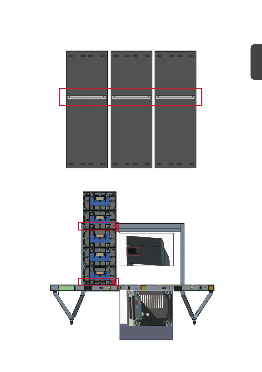 1. 確保三 (3) 個中間機櫃後側的三 (3) 個安裝架,位於下圖所示位置: