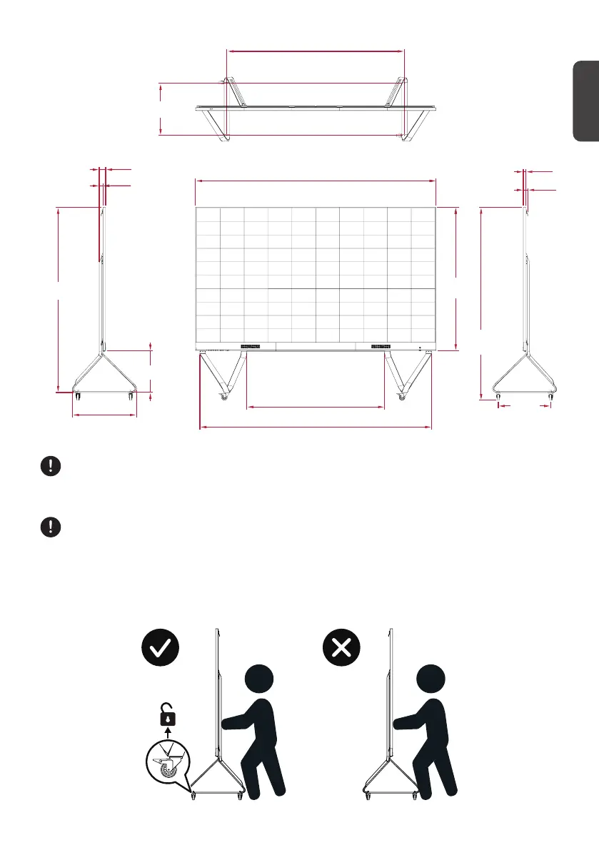 • DO NOT push the front of the display. Always unlock the wheels before moving.