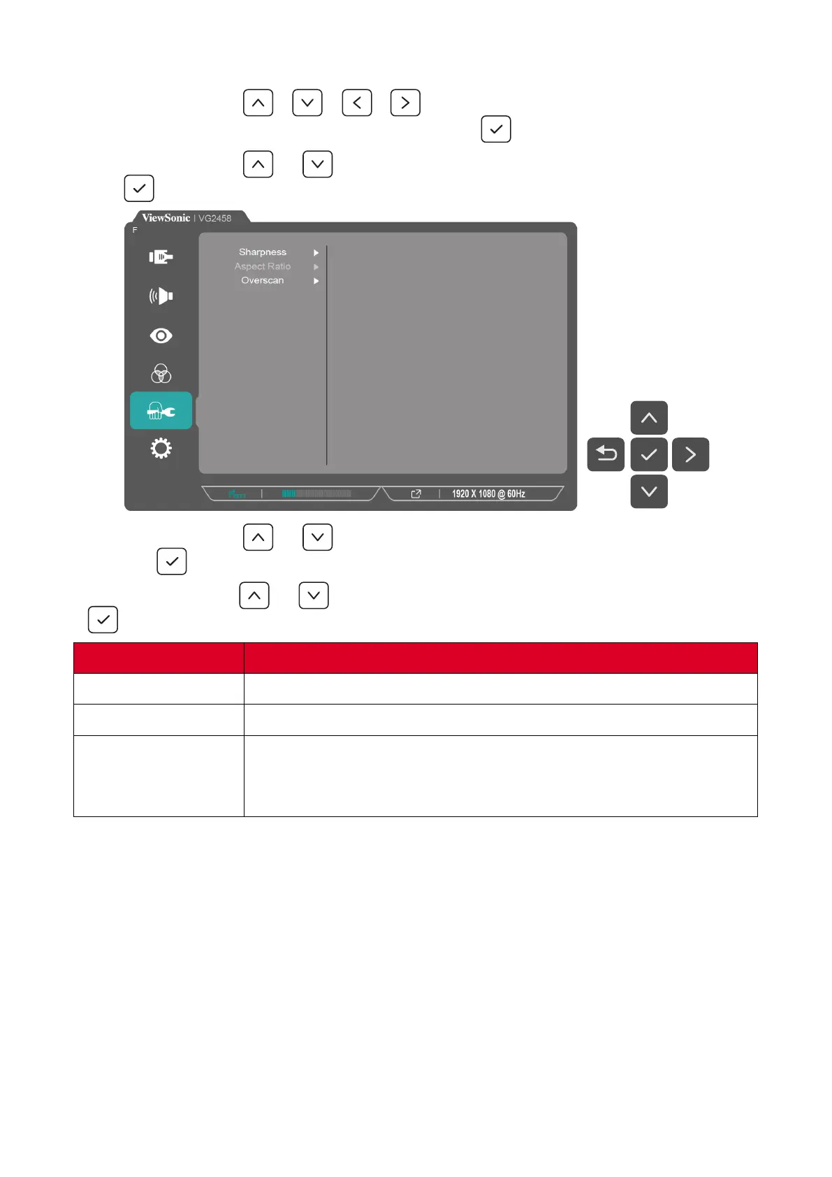 Sharpness Adjust the sharpness and picture quality of the monitor.