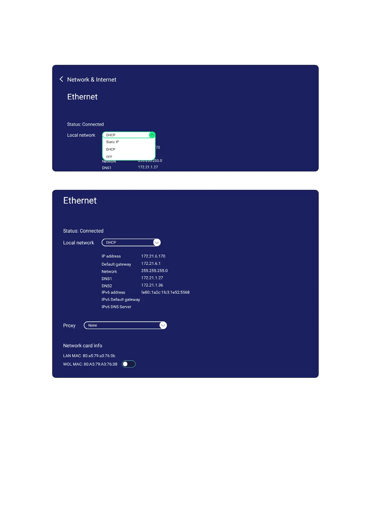 Tap the drop down menu to connect/disconnect the Ethernet.