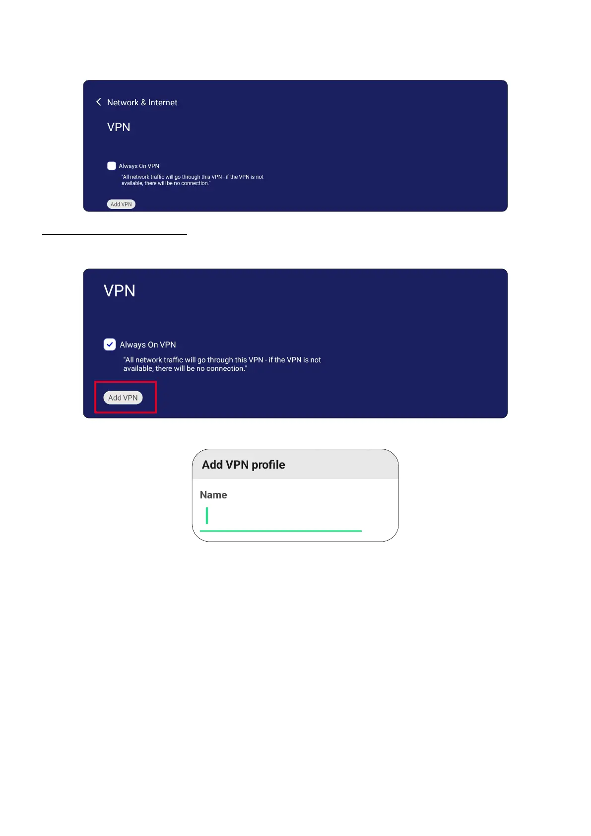 1. Go to: Sengs > Network & Internet > VPN and tap Add VPN.