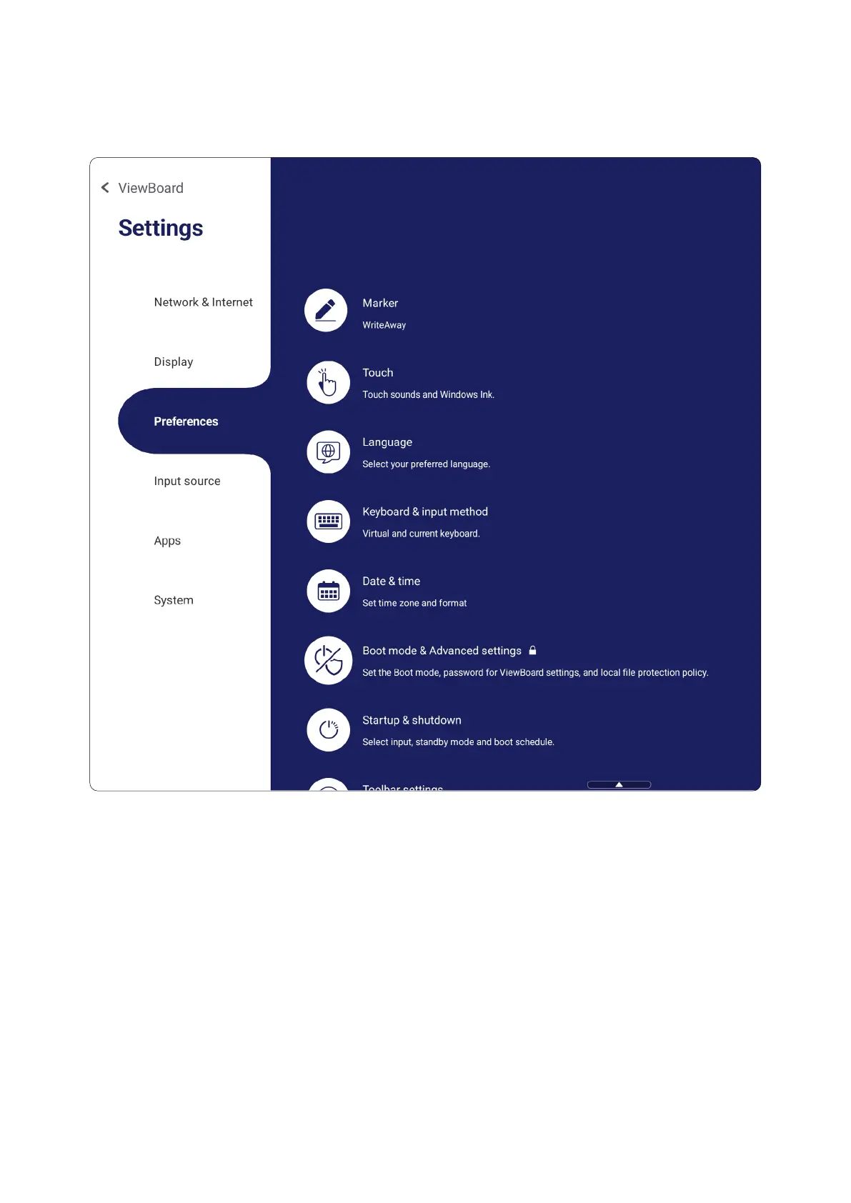 View and adjust Touch, Language, Keyboard & Input, Date & Time, Boot Mode &