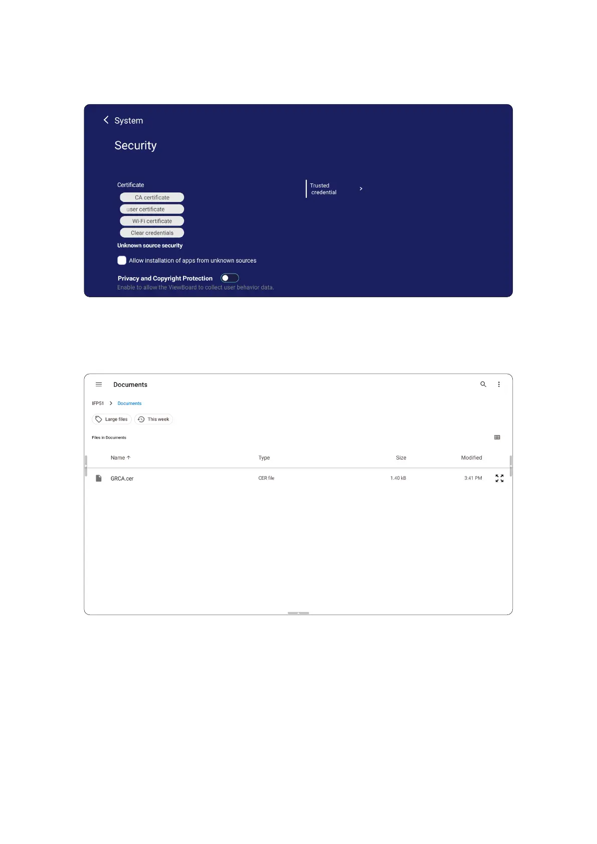 Review Cercate, Trusted Credenal storage, and Unknown sources install