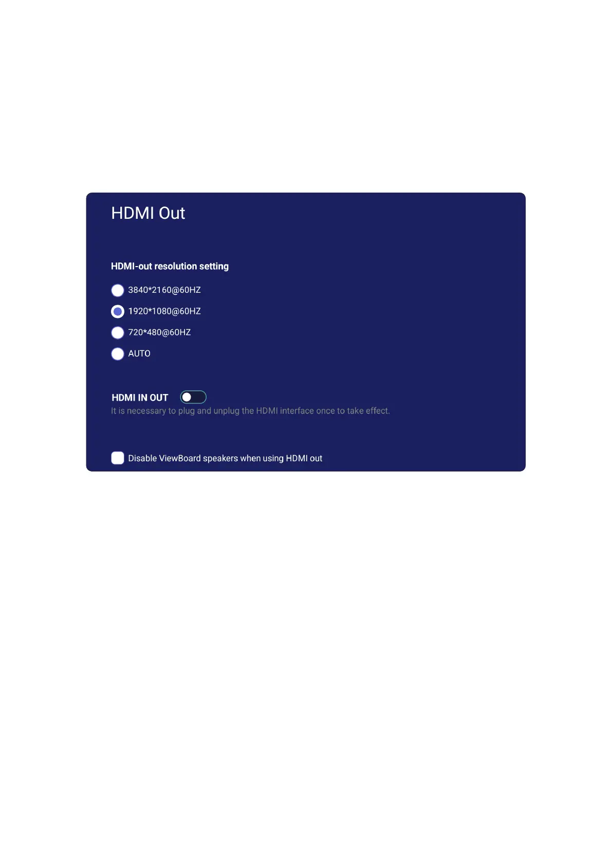 • The Disable ViewBoard Speakers when using HDMI Out opon box is not
