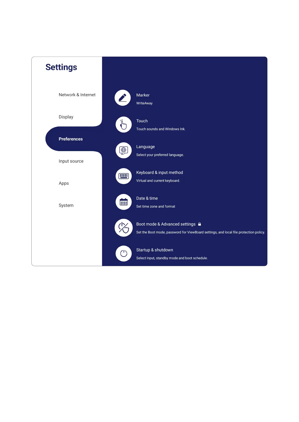 View and adjust Touch, Language, Keyboard & Input, Date & Time, Boot Mode &