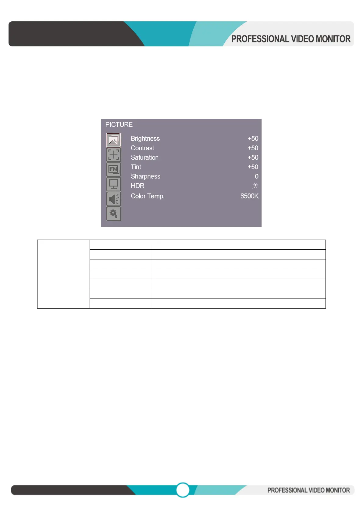 Adjust the color intensity from [0]-[100]. Turn the knob right to increase the color intensity and turn left to