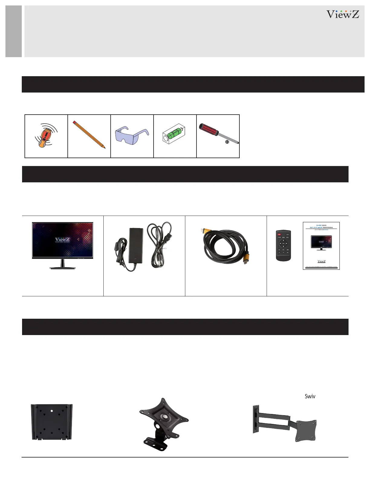 Your ViewZ monitor is shipped with all proper installaon hardware and components. If there are parts missing