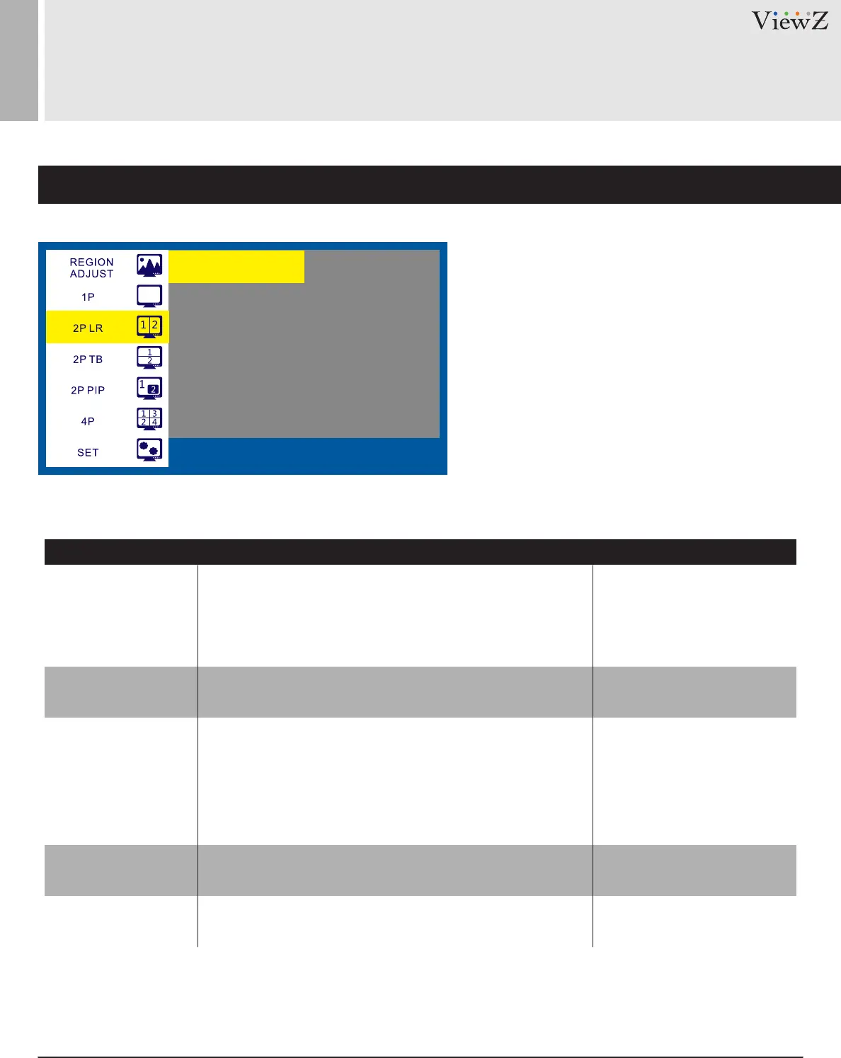 Select a display type among 1P, 2PLR, 2PTB, 2P PIP &
