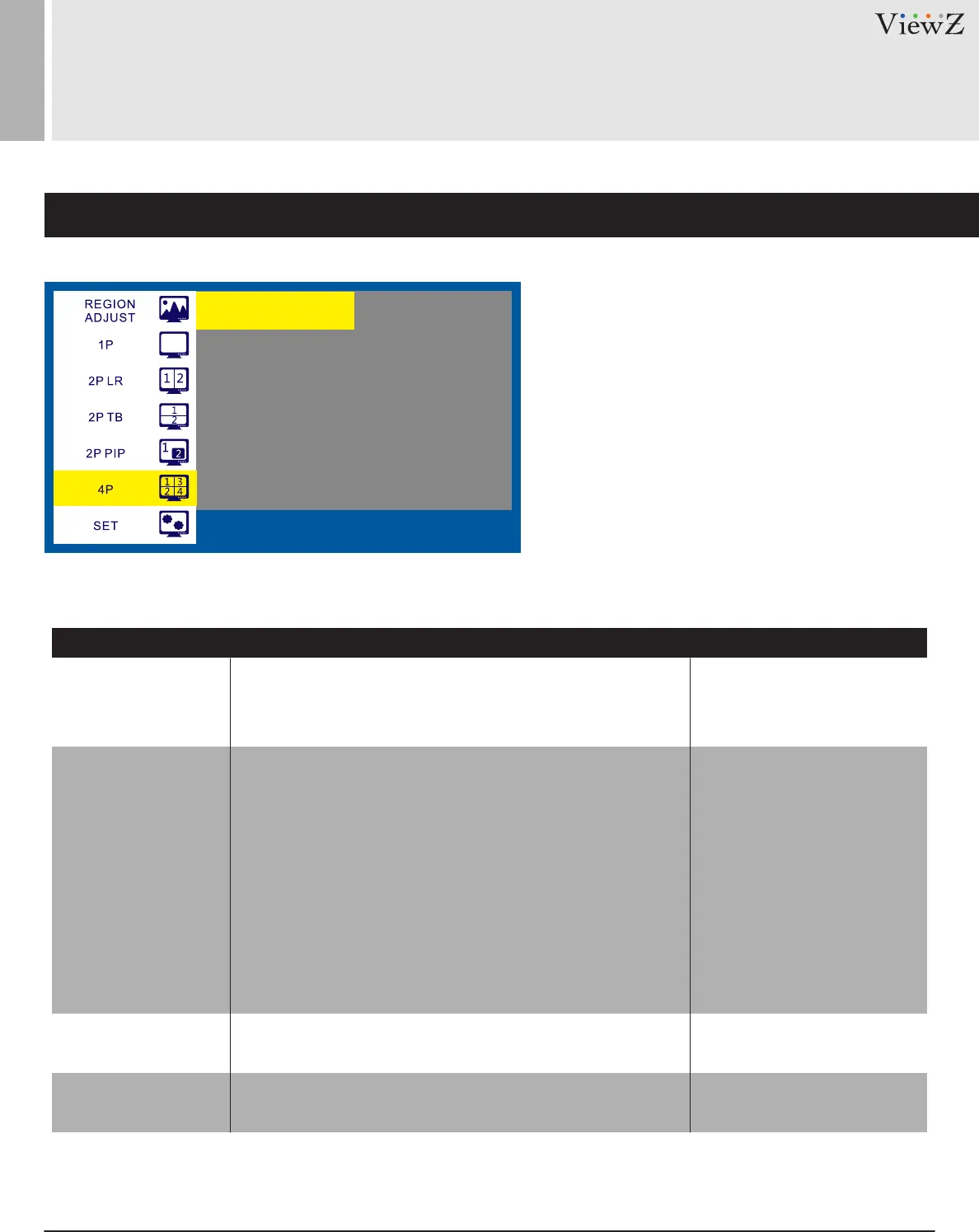 Select a display type among 1P, 2PLR, 2PTB, 2P PIP & 4P,