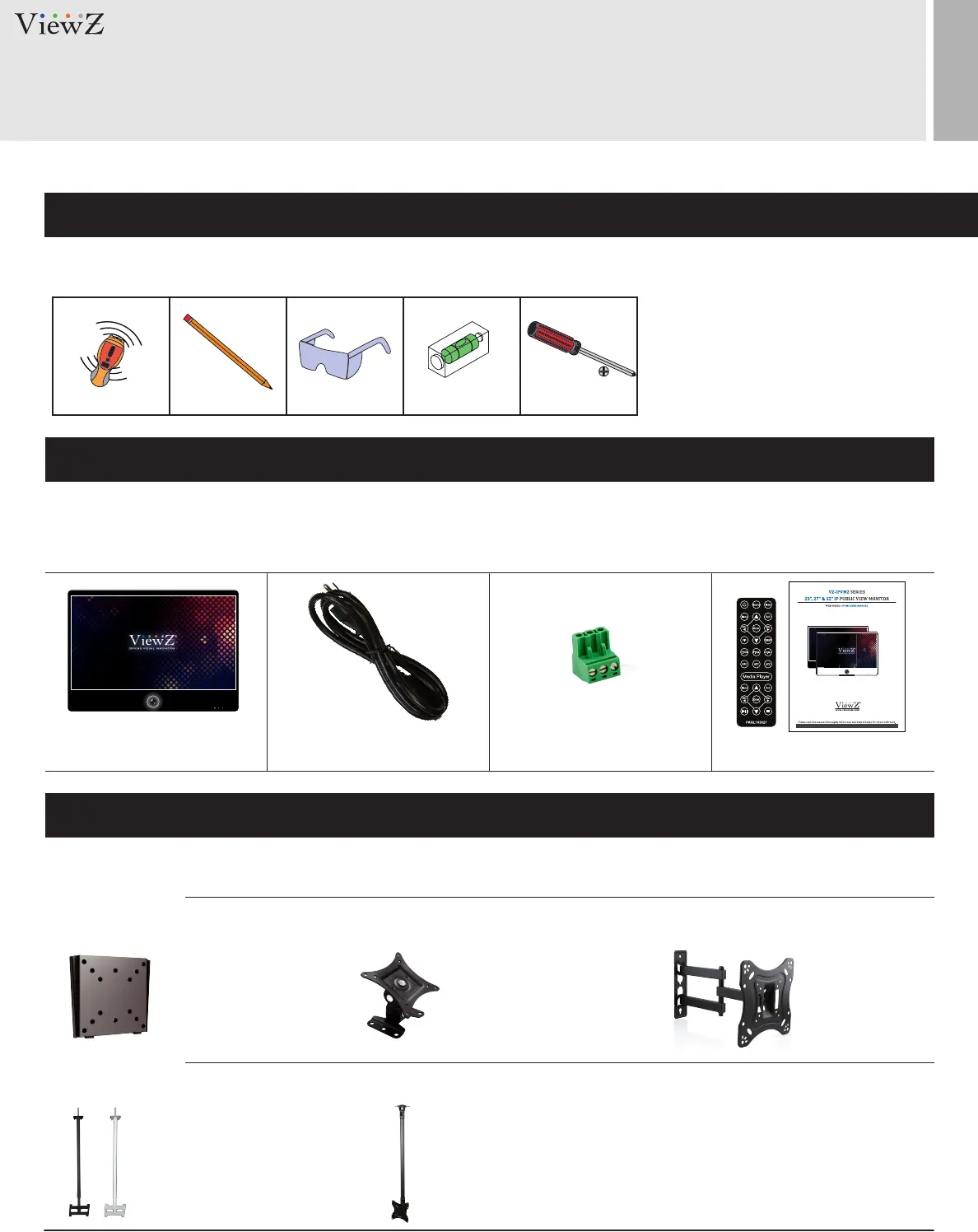 Your ViewZ monitor is shipped with all proper installaon hardware and components. If there are parts missing
