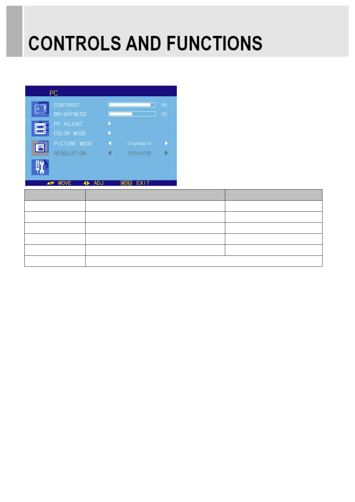 PC ADJUST Adjusts the PC Mode. See the table on Next page.