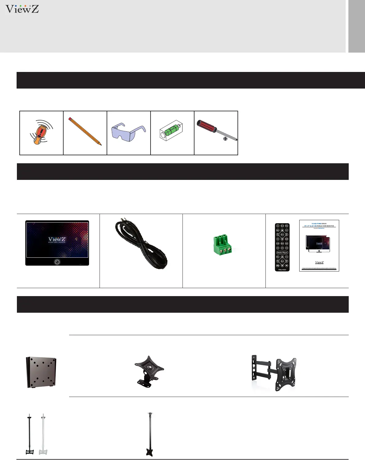 Your ViewZ monitor is shipped with all proper installaon hardware and components. If there are parts missing