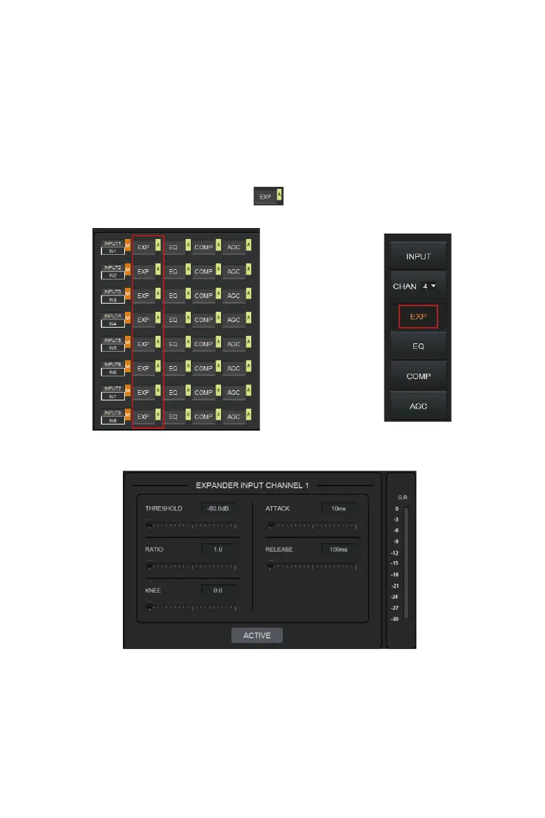 panel of the IN page. Audio process modules, such as, EXPANDER, EQUILIZER,