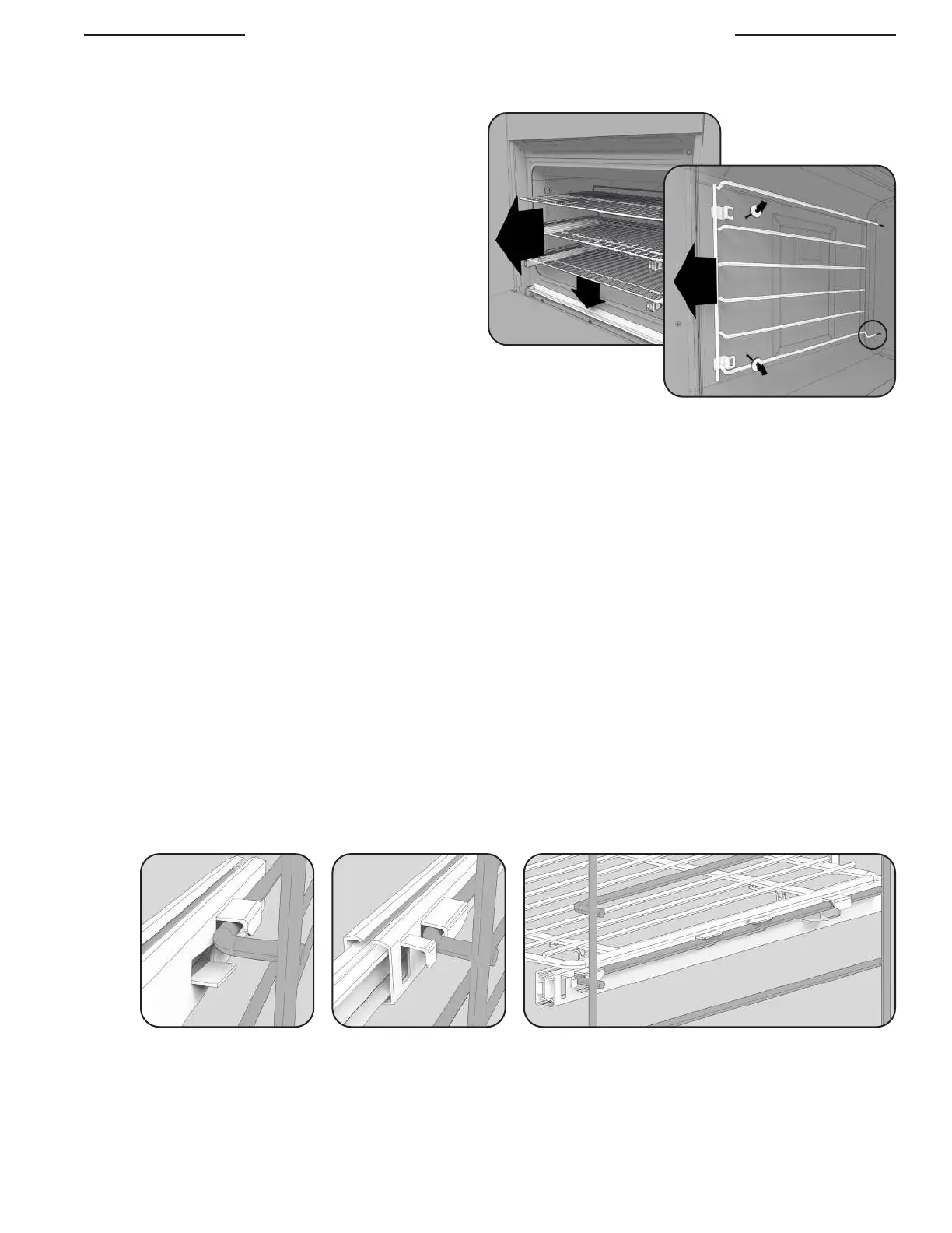 • Ensure the bent prong at the bottom back of the rack support is installed in the bottom hole in the oven cavity