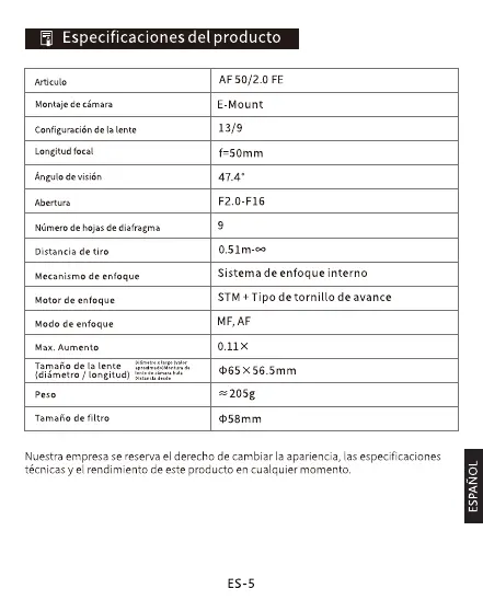 | Model | AF 50/2.0 Z |