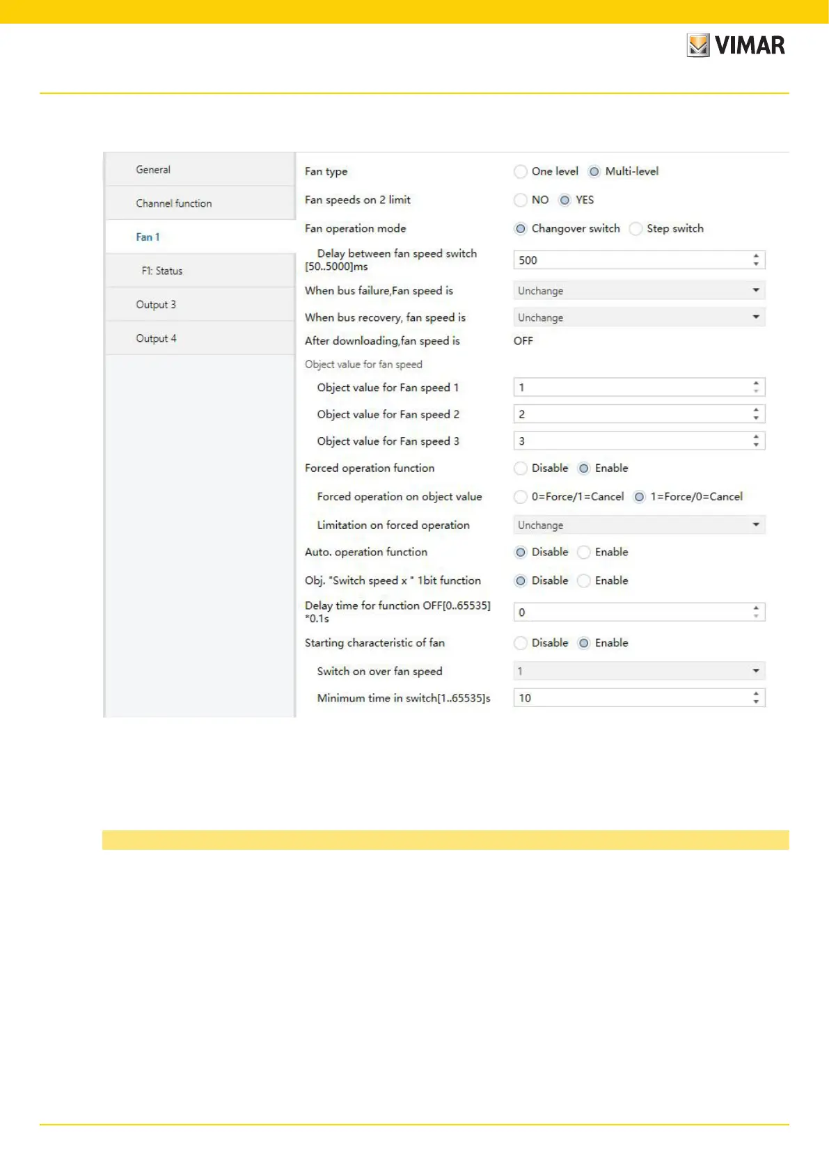 Yes: The fan can control 2 level fan speed, the maximum fan speed can only reach 2, even if the parameter sets the 3 level fan speed. The communication object