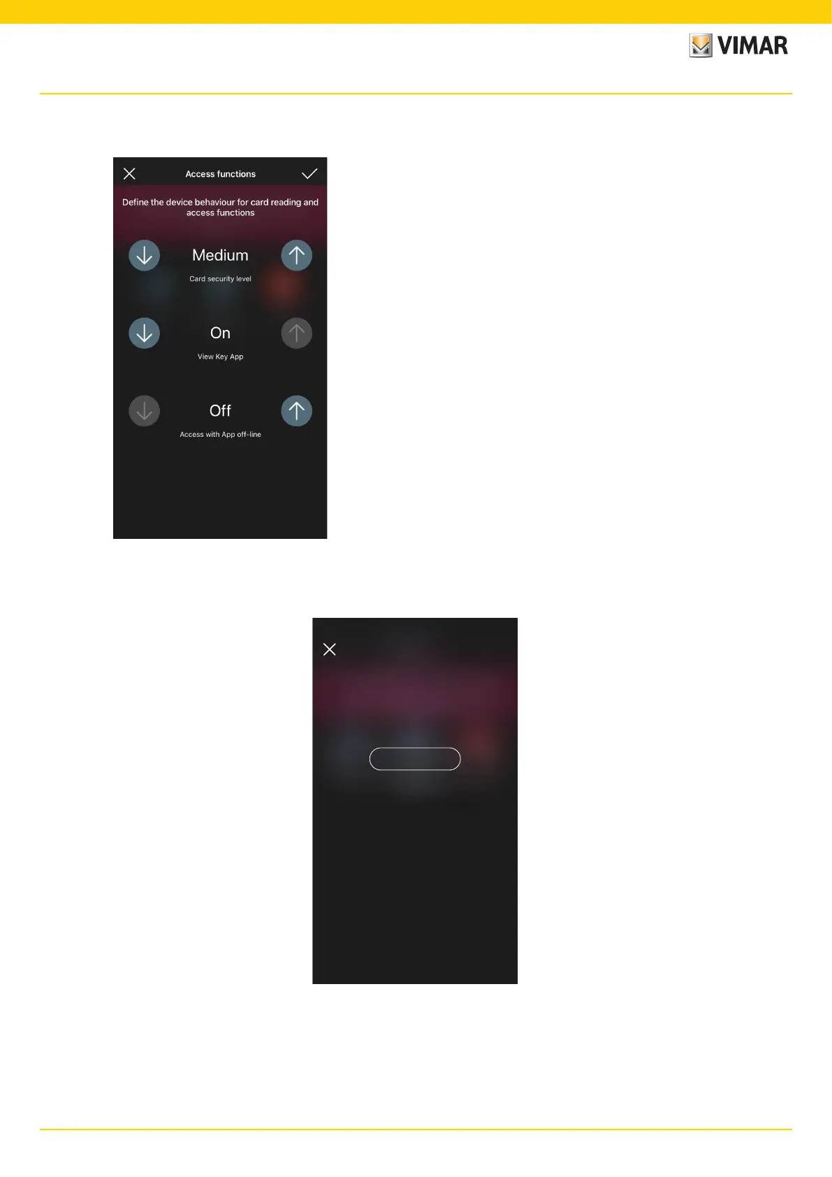 • Select "Access functions" to set how to use the device (via cards and/or App) and the security level relating to accesses using physical cards (we recommend “medium”