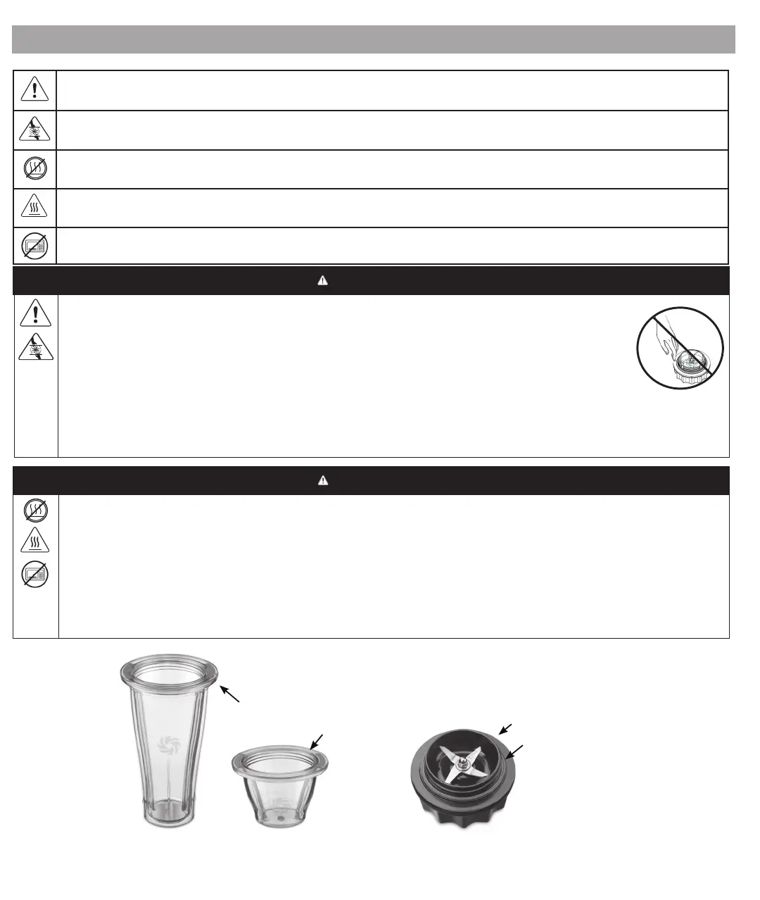 Para evitar daños o lesiones personales, NO use los vasos (incluida la base de las cuchillas o las tapas) en el microondas.