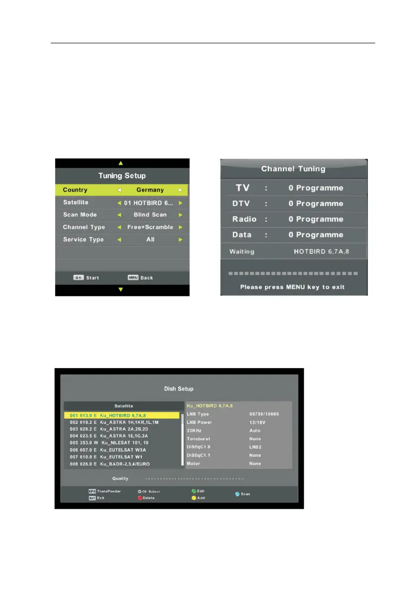 Press ▼ / ▲ për të zgjedhur Dish Setup (Vendosja satelitore Antenave), pastaj