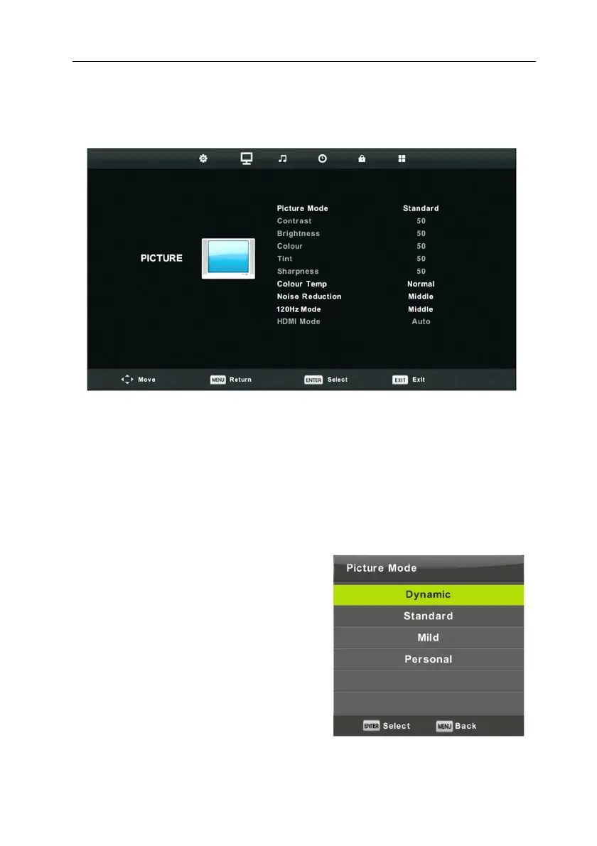 2. Pritisnite tipke ◄ / ► kako bi odabrali podizbornik PICTURE (SLIKA) u