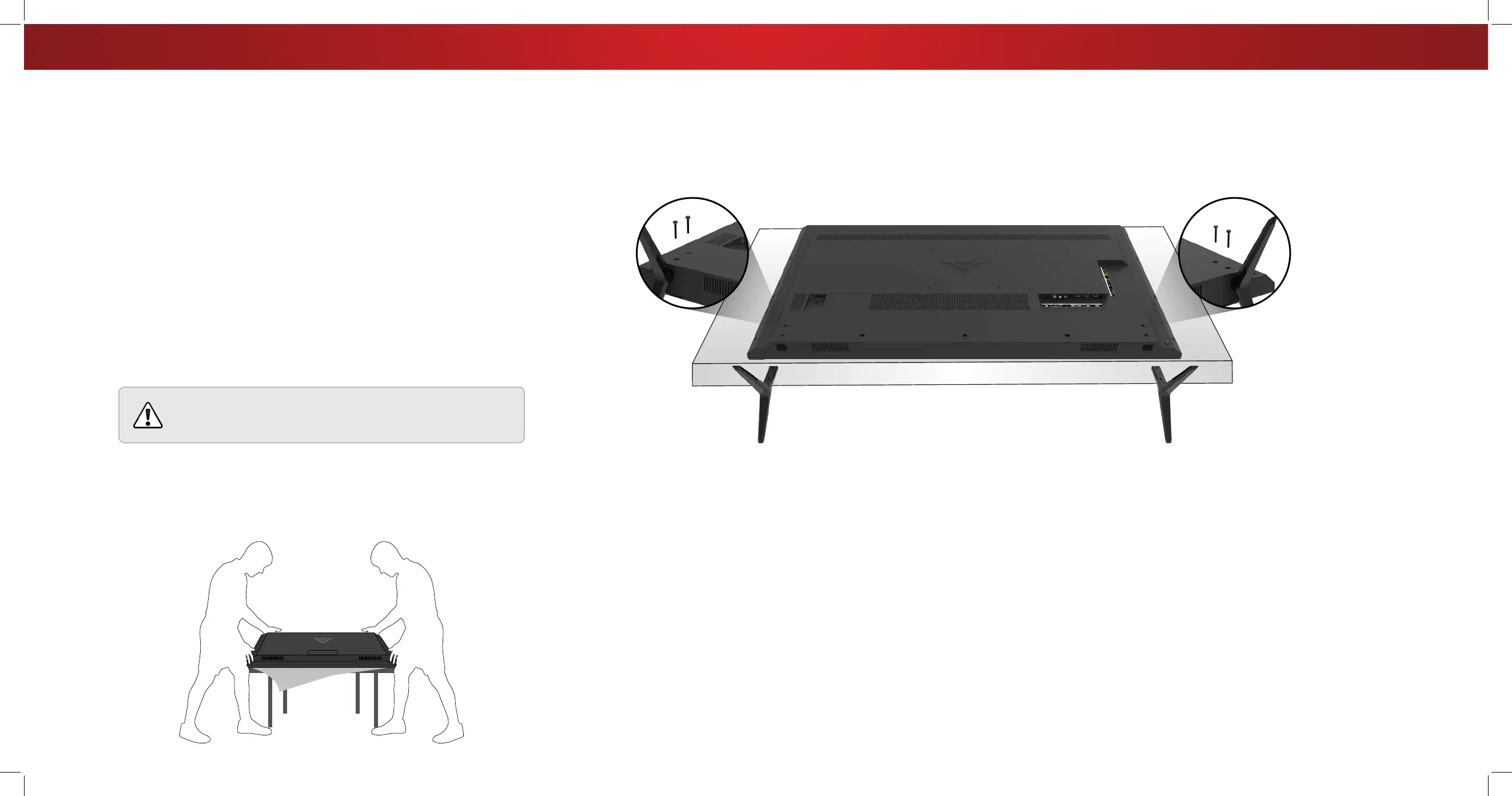 1. Insert the stands into the base of the TV. 2. Secure each stand to the TV with two (2) Phillips screws (included).