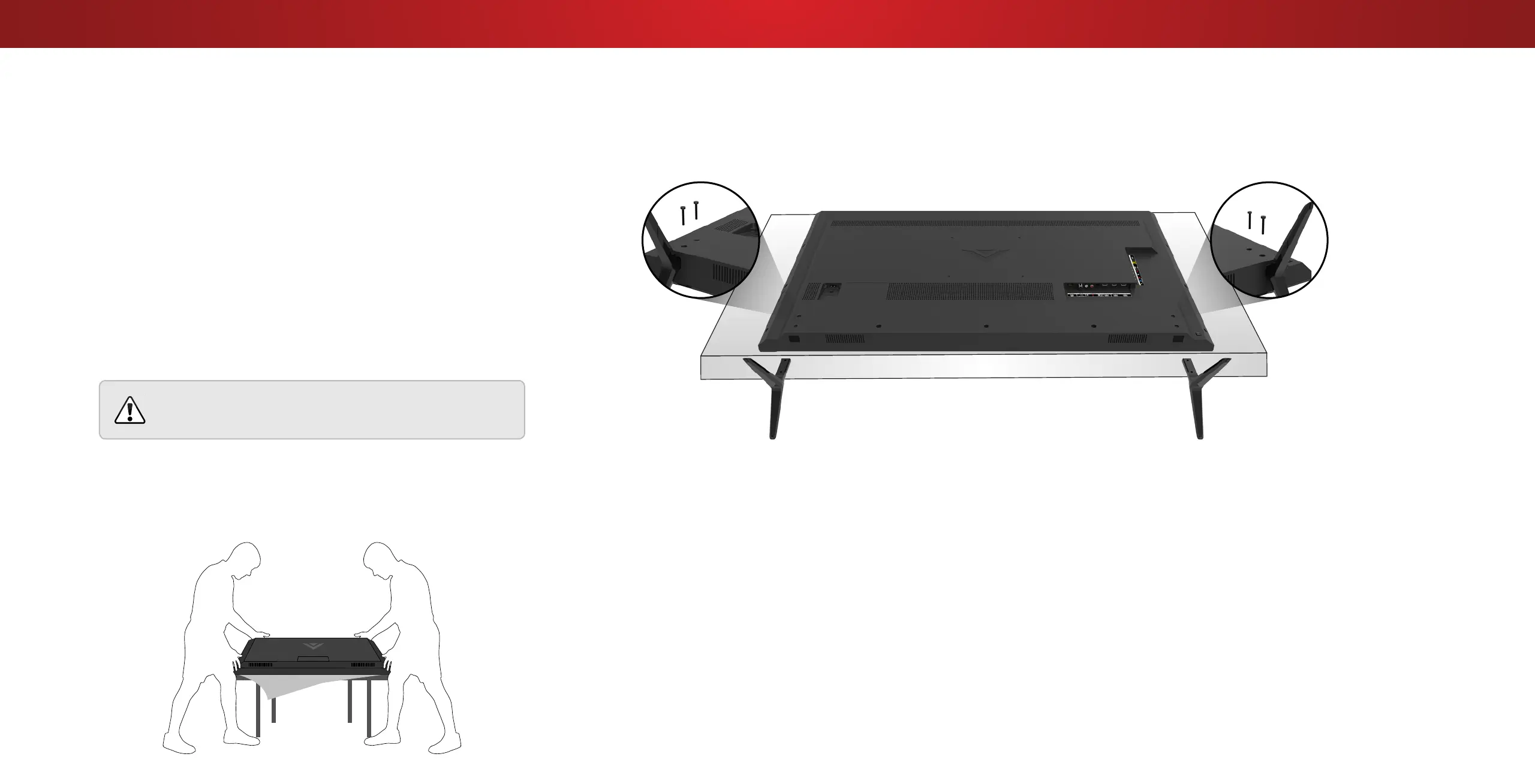1. Insert the stands into the base of the TV. 2. Secure each stand to the TV with two (2) Phillips screws (included).