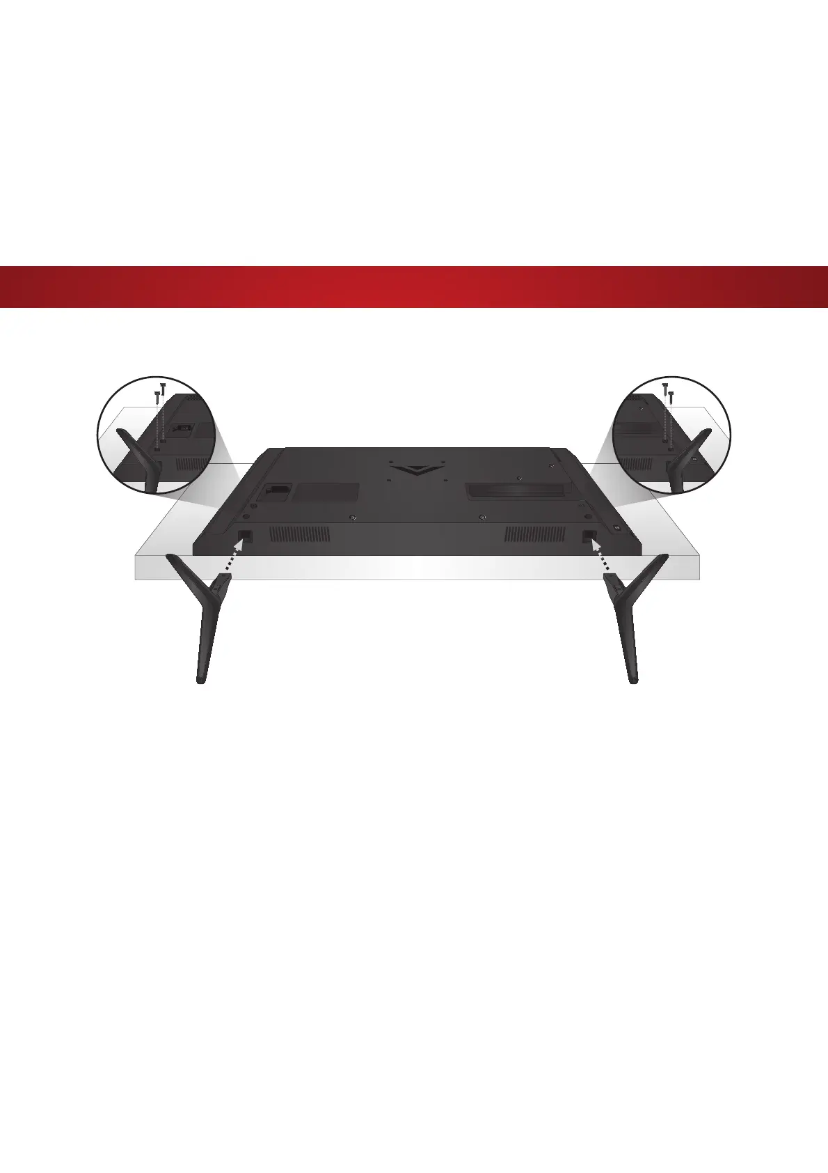 Insert the left and right stands into the base of the TV. (The stands are identical.)
