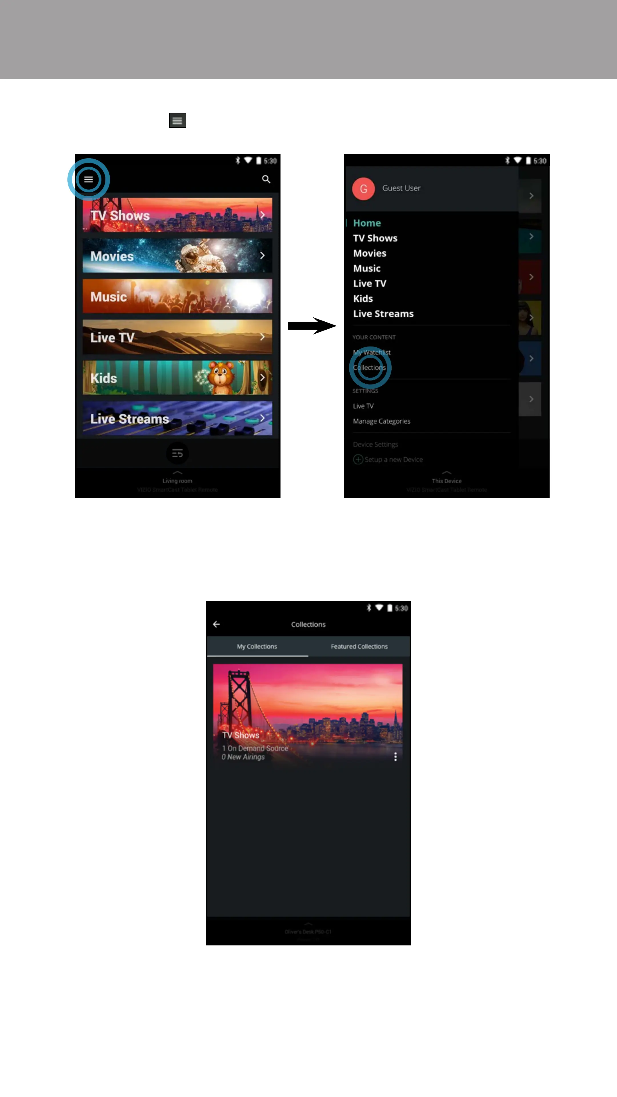2. The Collections menu is displayed. Tap on a title, select and source, and
